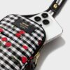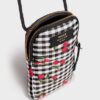 This phone bag is a water-repellent, 100% recycled fabric bag with a durable, adjustable cord made of recycled polyester, featuring a leather bucket and metal ends.