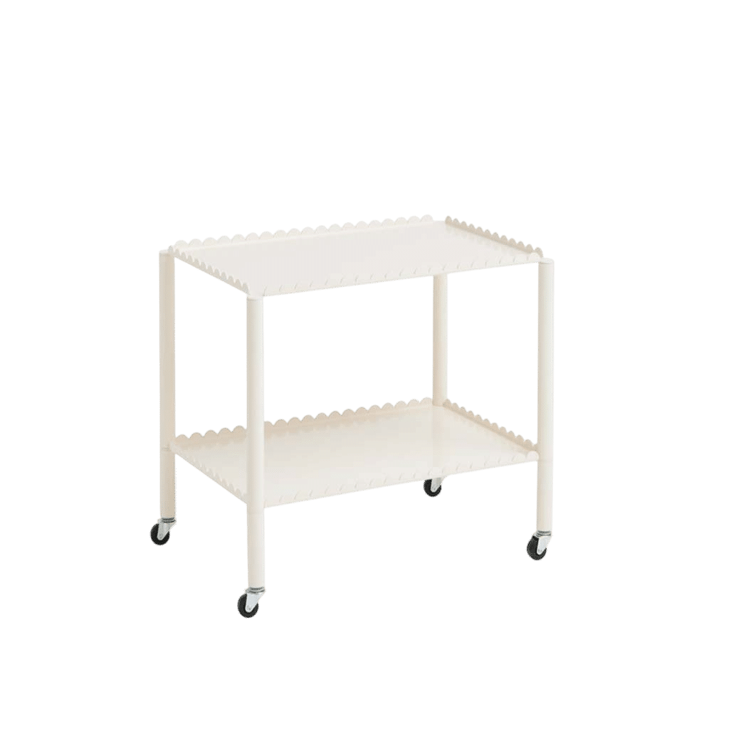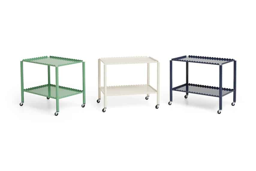 Designed by Belgian duo Muller Van Severen, Arcs Trolley is a functional and decorative trolley encased in a unified chain of vertical arcs. A small piece of furniture with a strong presence, the trolley combines industrial techniques with poetic lines to create a distinctive and sculptural expression. The elegant, scalloped frame supports two or three tiers, with slim legs mounted on castors for easy manoeuvring. Made in powder coated steel in different colour options, the trolley is suitable for most rooms and uses in the home, from displaying and storing items in the living room to extra shelving in the kitchen or as a bedside cabinet.