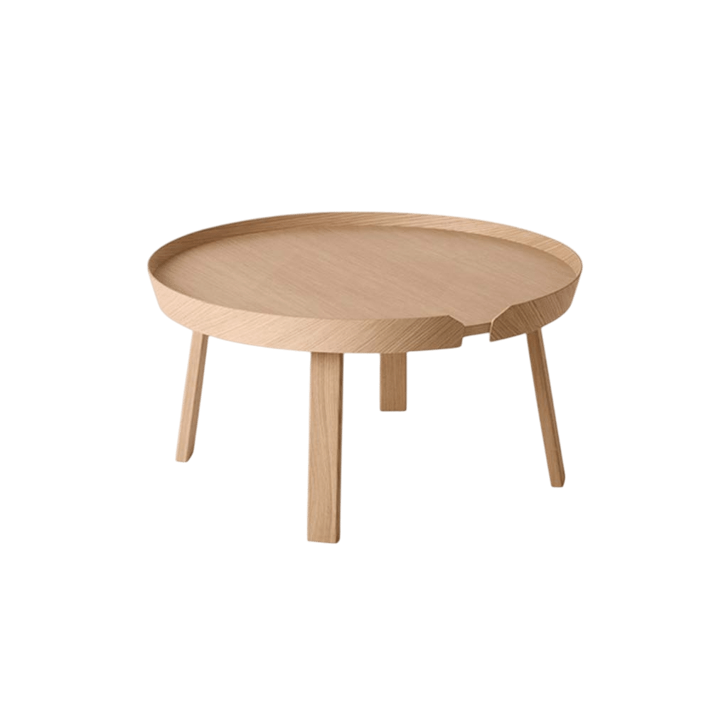 The Around Coffee Table, featuring a Scandinavian design inspired by a characterful wooden veneer frame, offers versatile versatility in various settings, including living rooms, lounges, lobby areas, and hotels.