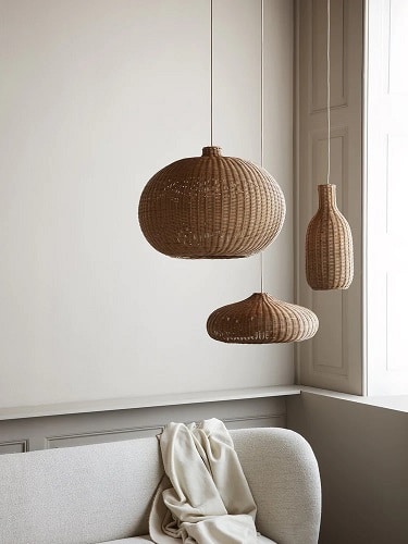 Hand-braided rattan domed lampshade offers natural light, allowing small glimpses and directed downward light. Ideal for ceiling hanging or corner focal point, providing a lovely room decoration.