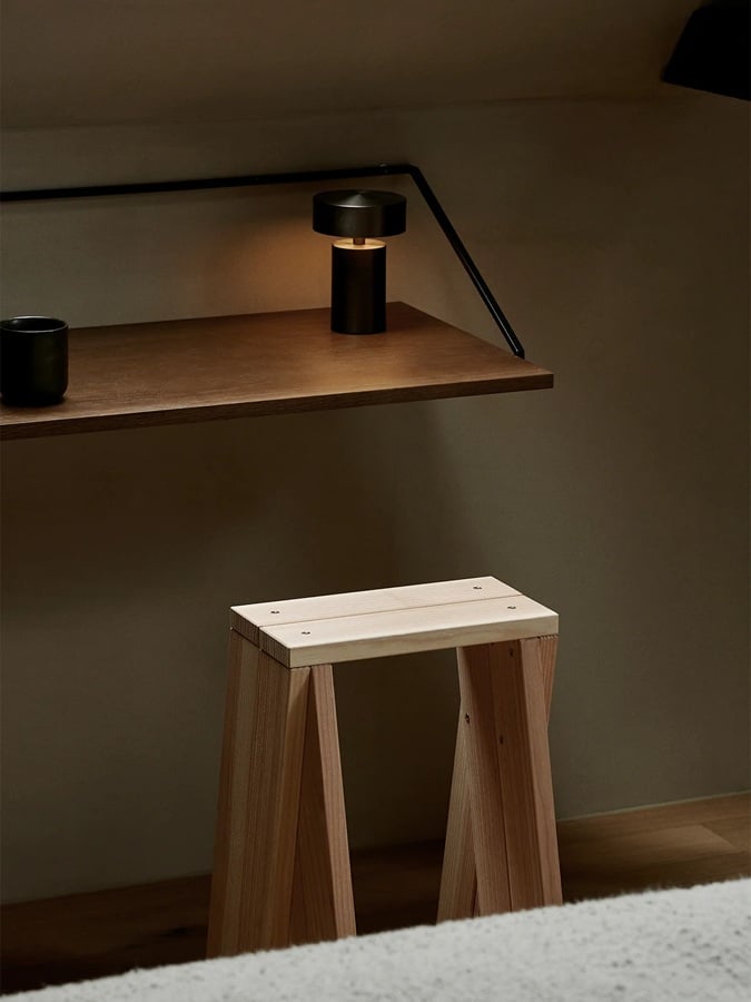 The portable Column Table Lamp, designed in a mushroom shape reminiscent of bollards used at jetties, merges technology with style. It is battery-powered for versatility and features adjustable brightness across three settings, suitable for both indoor and outdoor use. The lamp charges through a concealed USB socket and is compatible with Audo’s Charging Board for simultaneous device recharging. Crafted from lightweight, durable anodised or brushed aluminium, it offers an appealing finish ideal for various settings.