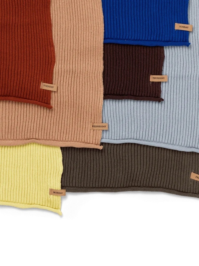 Day Cloths are a set of seven rib-knitted organic, GOTS-certified cotton yarn cloths celebrating each day of the week, providing a stylish and eco-friendly alternative to traditional kitchen cloths.