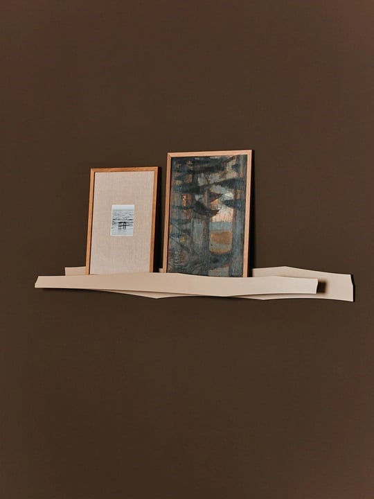 Leta Picture Rail is a durable wall-mounted storage solution for showcasing picture frames and small objects, inspired by fragmented cardboard and asymmetrical design.