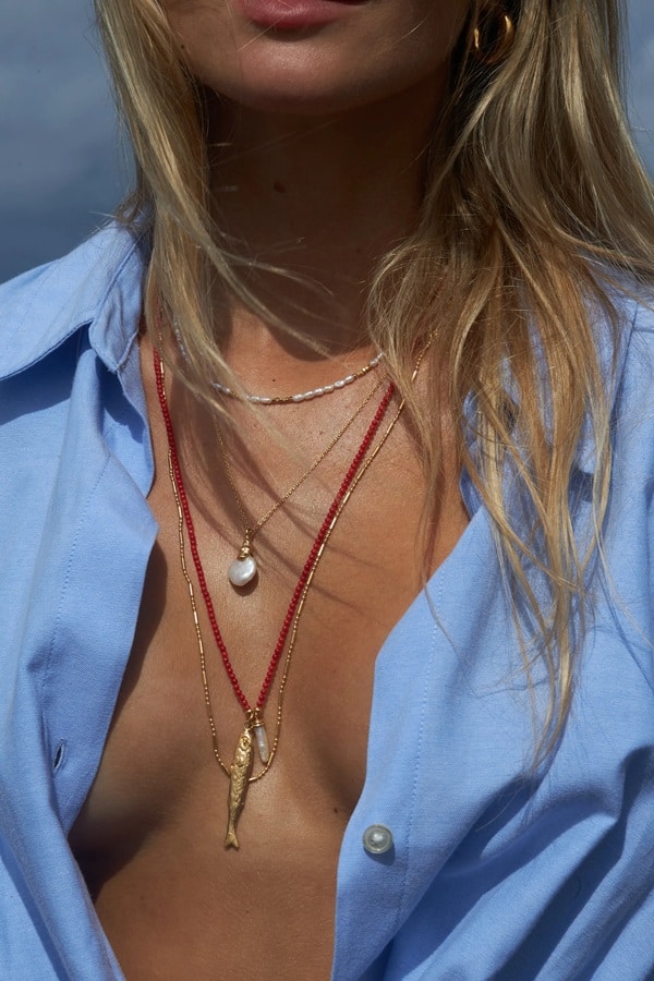 This playful freshwater pearl beaded choker necklace is a staple to every summer outfit. Fun to wear with other (colored) beaded necklaces or layered with gold-plated chain necklaces in different dimensions.