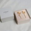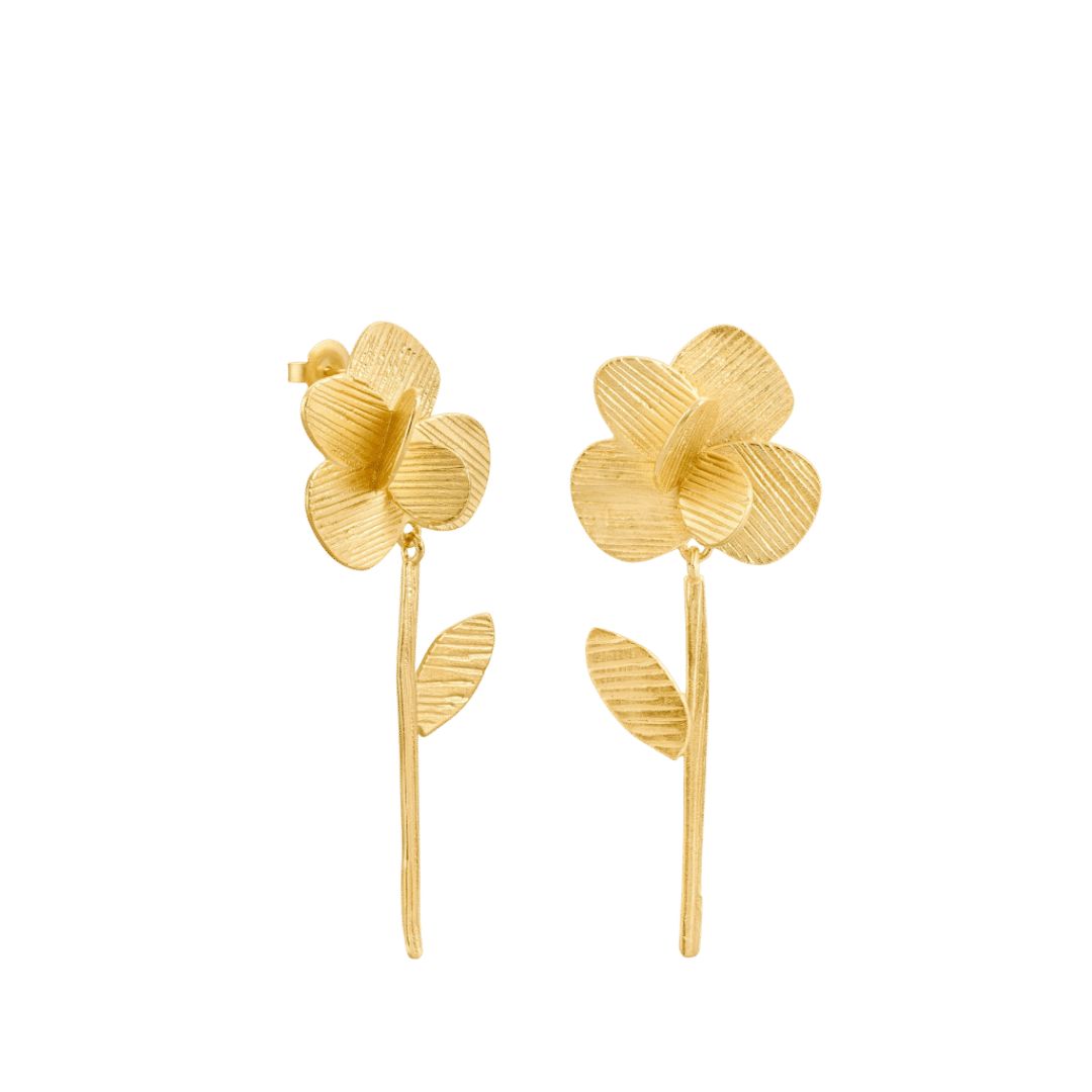 Long earrings made of 24 K gold-plated metal, inspired by the fleeting beauty of Mallorca’s wild peony. They feature a stem with movement, a textured design, and a butterfly nut closing.